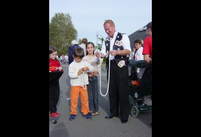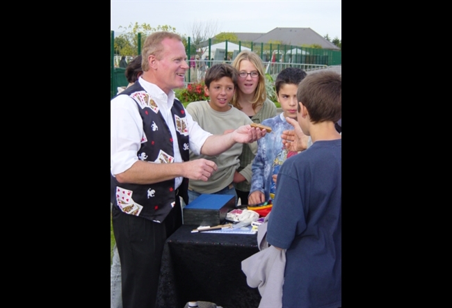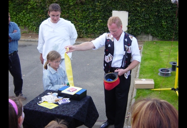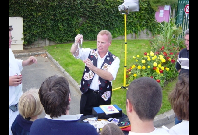 - Magicien effectuant des tours de magie sur guéridon mobile de point en point.